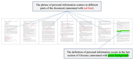 For example, according to Lebanoff et al. [8,9], personal information is annotated as a common vague phrase in the privacy policies of the top websites ranked on Alexa.com accessed on 4 April 2023 [10]. However, according to our observations, most of these policies contain the explanation of this important phrase scattered in different parts of the documents, some of which appear around its first appearance and some in the specific glossary section. For instance, in the crowdsourcing annotations of Lebanoff et al. [9], personal information appears 16 times in the overall 63 annotations of vague terms (≈25.4%) in the privacy policy of Groupon (updated on 13 September 2012). However, the document contains a specific section, Glossary of Terms, which provides a detailed explanation of this phrase, including its definition and compositions. We show the example of Groupon in Figure 1, in which we mark each appearance of personal information with red font and its definition with a green background. We believe that the degree of vagueness of this phrase given by the annotators will be mitigated greatly with the assistance of this definition. In other words, it is quite possible that a large portion of vague words or sentences detected by these approaches is actually false vagueness.