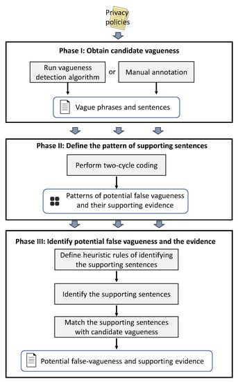 The remainder of this paper is organized as follows. In Section 2, we make a simple survey about the definition of vagueness and the existing research on vagueness prevention in privacy policies. In Section 3, we depict the whole framework of this work. In Section 4, we report the definition of four types of potential false vagueness and three patterns of supporting evidence. Then in Section 5 and Section 6, we report the detailed procedure of our approach on the identification of the potential false vagueness and the related supporting evidence. Finally, in Section 7 and Section 8, we discuss the threats to validity and give the conclusion of our work.