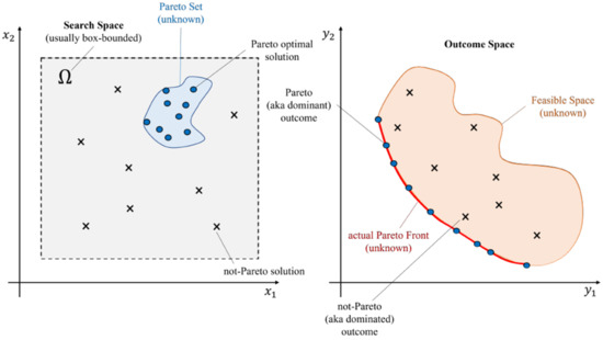 where multiple objectives have to be simultaneously optimized. It is important to note that these objectives may be in contrast with each other, meaning that an improvement in one objective could compromise the others. Consider that two points, , are said to dominate iff and for at least an index . There is not one optimal solution in multi-objective optimizations; instead, the goal is to find the set of non-dominated solutions, i.e., the Pareto set. The image of the Pareto set, i.e., the set of all non-dominated objective vectors, is called the Pareto front. All the points having the associated on the Pareto front represent the best trade-offs between the conflicting objectives. Figure 1 shows an example of the Pareto set and the corresponding Pareto front.