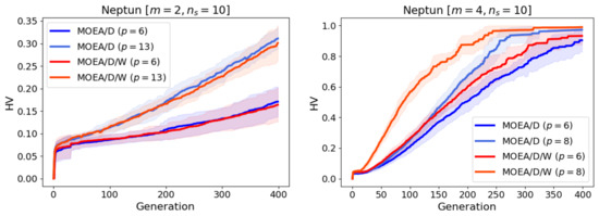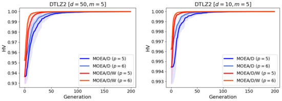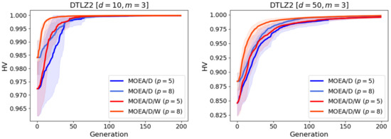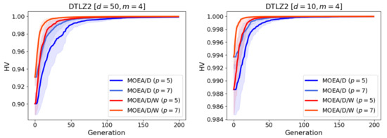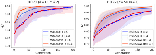 For , MOEA/D/W is marginally better than MOEA/D for both values of (Figure 6).