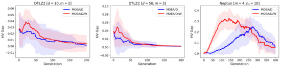 For MOEA/D and MOEA/D/W show the same performance in terms of hypervolume for both values of (Figure 5).