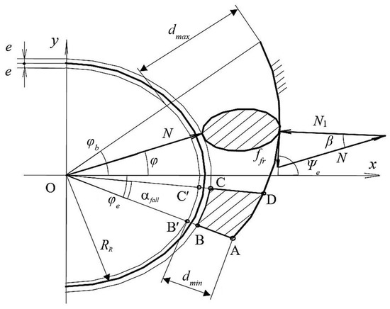 dmax (approximately 300 mm for mine crushers), and keeping the piece during crushing in the crusher chamber. It is necessary to devise a calculation scheme to obtain the equations of the curve of the rational form of the jaw. This diagram should show the forces acting on a piece of rock in the crushing chamber on the parts of the roll and jaw. Choosing a rational shape for the jaw profile allows the equilibrium of a piece of rock in the crushing chamber to be achieved. This ensures retention of the piece of rock in the chamber during its crushing. The diagram of the interaction of the piece of rock with the roll and the jaw is shown in