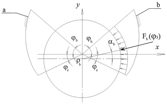 The positive direction is the counterclockwise direction of the rotation. Crusher jaws are marked as “a” and “b”. The angles are counted upward from the axis x, i.e., the angle φb shown in the figure has a positive value, and a negative value applies to angle φe.