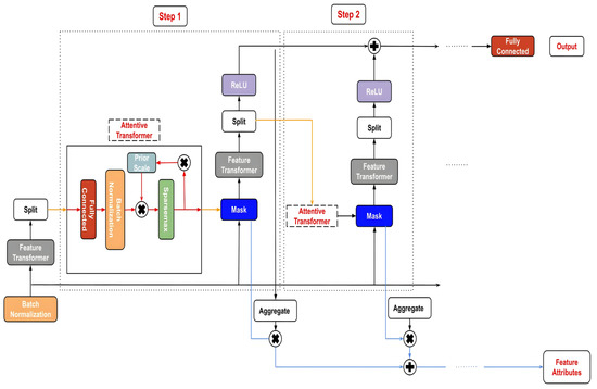 TabNet (TN) is a deep learning model that is constructed on the foundation of sequential multistep processing [44]. TN’s architecture enhances the ability to learn high-dimensional features and helps in feature selection. Each nth stage generates an output for a Feature Transformer block after processing a d-dimensional feature vector. This feature transformer block has several levels that are either common to all decision steps or specific to a certain decision step. A batch normalization layer, a Gated Liner Unit (GLU) activation, and fully linked layers are all present in every block. The GLU also has a link to a normalization residual connection, which reduces the variation over the whole network. This multi-layered block improves the parameter efficiency of the network and aids in feature selection.