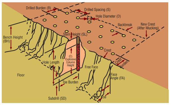 - Gupta, R.N.; Bagchi, A.; Singh, B. Optimising drilling and blasting parameters to improve blasting efficiency. In Status Report; CBIP Rock Mech: New Delhi, India, 1988; pp. 185–206. [Google Scholar]