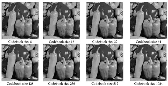 Decompressed images of PEPPERS with respect to codebook size.