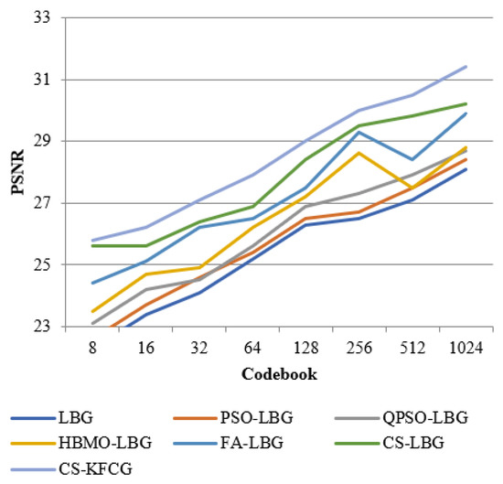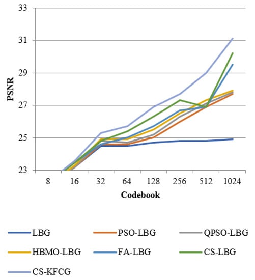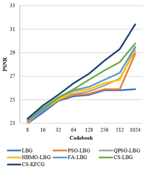 The input vector that is encoded using a codebook is . The result for the proposed CS-KFGC algorithm was produced by calculating PSNR and bits per pixel (bpp) and both were matched with different algorithms. The PSNR values and the computational time was calculated with varying sizes of codebook, i.e., 8, 16, 32, 64, 128, 256, 512, and 1024.The characteristic of the reconstructed image and calculation of data dimension of the compressed image with differing codebook intensity, i.e., 8, 16, 32, 64, 128, 256, 512 and 1024, can be assessed by PSNR: