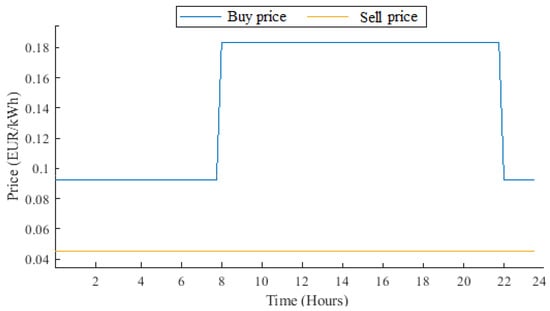 where and denote the electric power purchase and sell to the community, respectively. and are the buy and sell price of electric power, and is the time period adjustment factor. The power loss multipliers for power purchase and sell are and correspondingly. The sum of the power loss multipliers is taken as 5% [41].