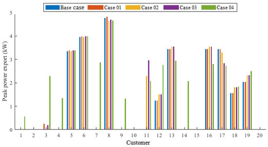 Figure 3 depicts the peak power export of all twenty customers. As the optimization model for reducing the economic cost of the community ran, it was discovered that only a few customers exported a negligible quantity of energy to the community. Therefore, the most cost-effective option for these consumers was to generate their own electricity. On the other hand, exporting excess electricity to a utility or community was the best method to reduce system costs, so few customers had a substantial quantity of excess electricity. Comparing the average power exported in all five cases, the base case exported the least power, while case 04 exported the most.