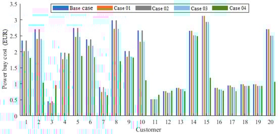 Table 4 and Figure 4 present the statistics for the local cost of purchasing electricity for five cases. The case-by-case results presented in Table 4 depict the minimum and maximum power purchase costs incurred by customers, the average power purchase cost, and the reduction in power purchase costs compared to the base case. In this context, average power buy cost refers to the ratio of the sum of power buy costs for all customers in a specific case to the total number of customers. Figure 4 depicts the comprehensive results of the power purchase cost for all consumers in all circumstances.