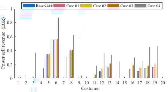 Table 5 and Figure 5 detail the revenue derived from the sale of energy to the community. Comparing all cases, it is evident that the base case had the lowest economic benefit for customers, while case 04 had the highest. Case 04 has an average revenue of 0.274 EUR, which was 163.46% higher than the base case. Customers were permitted to sell power in their local community at a mid-market price that was less than the utility grid export price, and they were also permitted to purchase power at a mid-market price that was less than the utility grid import price.