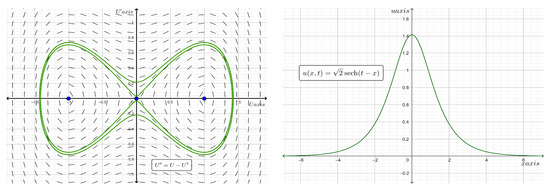 Phase plane diagram (on the left) of the traveling wave system for Equation (10) and the two-dimensional plot (on the right) of the analytic bell type solitary wave solution for the case where and at time .