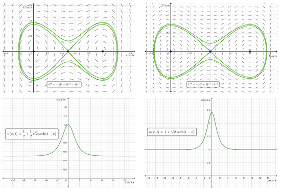 which is a localized solitary wave of the bell type, traveling at any velocity , where . Clearly, approaches as . The proliferation rate is a cubic function with three roots, namely, and . Figure 2 shows the phase portraits of the traveling wave systems for Equation (12) and the two-dimensional plots of the analytic bell type solitary wave solutions when and or at time . Additionally, when we find , and thus, a standing wave solution exists for the reaction–diffusion equation given by