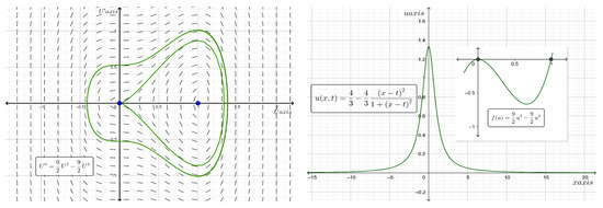 Figure 6. Phase plane diagram (on the left) of the traveling wave system for Equation (20) and the two-dimensional plot (on the right) of the analytic kink type solitary wave solution along with the graph of for the case where at time . - When and , where a number , has the roots and 1, and hence, is a cubic function with a strong Allee effect. Consequently, the kink (anti-kink) solution is a solitary wave with asymptotic values of 0 and 1 at the left and right infinities. On the other hand, when , we find , and thus, a standing wave solution exists. Figure 7 shows the phase portraits of the traveling wave system for Equation (20) and the two-dimensional plot of the analytic kink type solitary wave solutions along with the graph of the proliferation rate for the case where and at time .