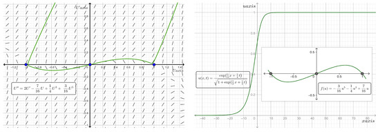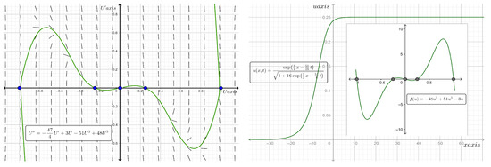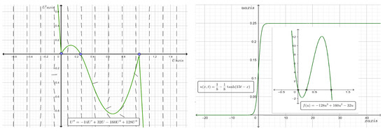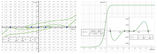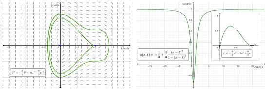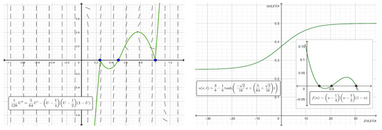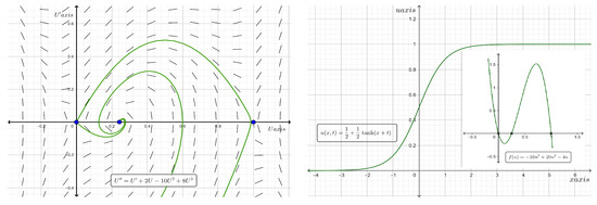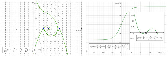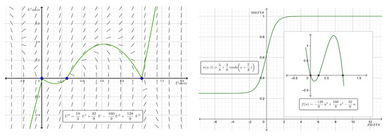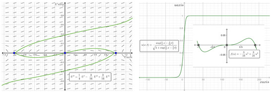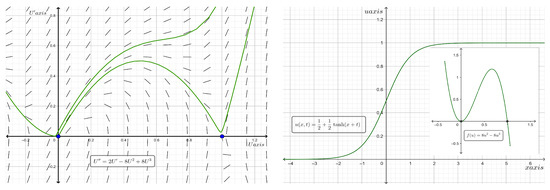 Figure 15. Phase plane diagram (on the left) of the traveling wave system for Equation (36) and the two-dimensional plot (on the right) of the analytic kink type solitary wave solution along with the graph of for the case where and at time . - When and , where a number , has five real roots, and , and hence, is a nonlinear function with a strong Allee effect. Consequently, the kink (anti-kink) solution is a solitary wave with asymptotic values of 0 and 1 at the left and right infinities. On the other hand, when , we find and thus, a standing wave solution exists. Figure 16 shows the phase portraits of the traveling wave system for Equation (36) and the two-dimensional plot of the analytic kink type solitary wave solutions along with the graph of the proliferation rate for the case where and at time .