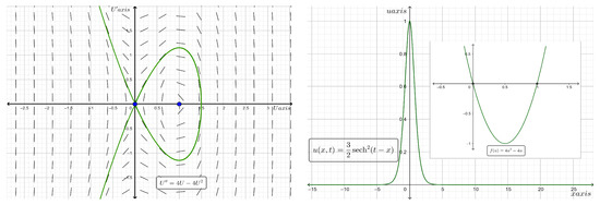 Phase plane diagram (on the left) of the traveling wave system for Equation (14) and the two-dimensional plot (on the right) of the analytic bell type solitary wave solution along with the graph of for the case where and at time .