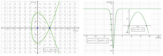 which is a localized solitary wave of the bell type, traveling at any velocity . It is obvious that approaches as . The proliferation rate is a quadratic function with logistic growth that has two roots, namely, 0 and . Figure 10 shows the phase portraits of the traveling wave system for Equation (26) and the two-dimensional plot of the analytic bell type solitary wave solution for the case where and at time . Additionally, when we find and thus, a standing wave solution exists for the reaction–diffusion equation given by
