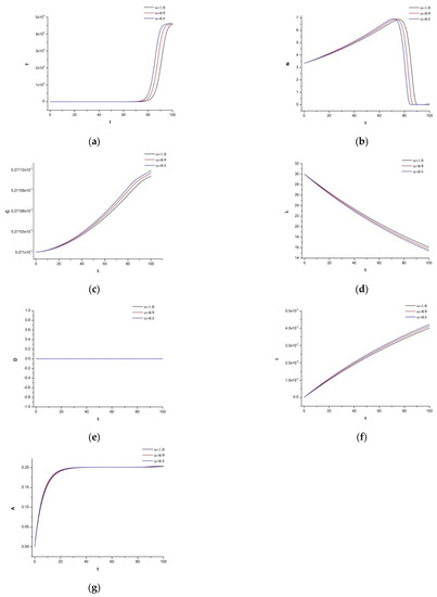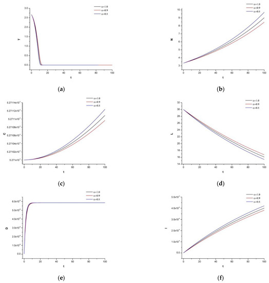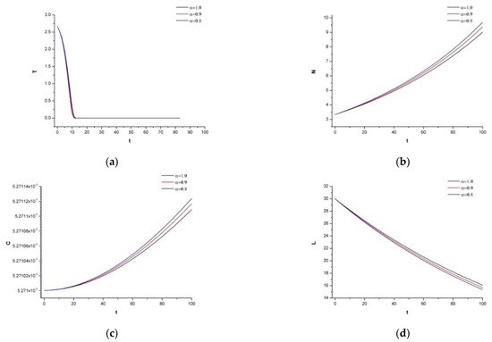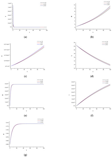 Hence, fractional-order differential equations can more accurately depict a variety of complicated biological processes with nonlinear dynamics and long-term memory that cannot be theoretically expressed by ODEs. Additionally, the conversion of an ODE model into an FDE model needs to be precise in terms of differentiation order because even a small change can have a big impact on how the solutions behave [17,18,19,20,21,22,23].