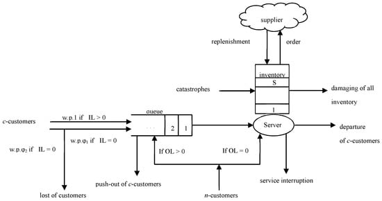 In the system, catastrophic events can occur only in its warehouse part. The flow of catastrophic events is Poisson one with the parameter , and at the moment of arrival of such an event, all the reserves of the system are instantly destroyed. As a result of the catastrophes, even the stock, which is at the status of release to the c-customer, is destroyed. In the latter case, the c-customer whose service was interrupted due to a catastrophe is returned to the queue; in other words, the catastrophe only destroys the stocks of the system and does not force c-customers out of the system. If the inventory level is zero, then the disaster does not affect the operation of the system warehouse.