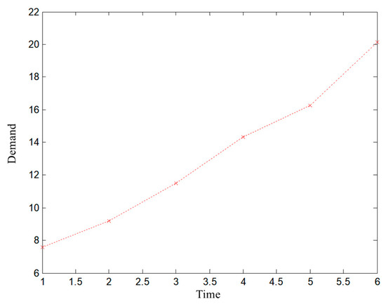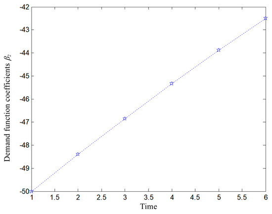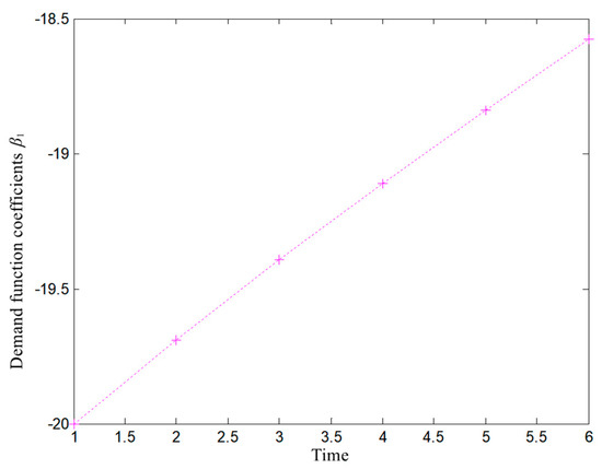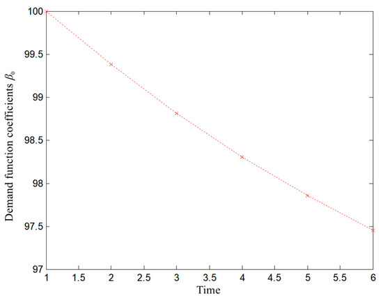 Based on the derived and reference prices and the two previous assumptions, this study will further simulate how the demand function coefficients are updated. Figure 3, Figure 4 and Figure 5 illustrate the update of these coefficients. With a demand-learning seller, the change in market aggregates in each period is not significant, and the gap between the first and sixth issues is only 2.5 units (see Figure 3). In other words, consumers do not react strongly to more “intelligent” sellers. The change in the price impact factor for each period is also insignificant (see Figure 4), with only 1.5 units. However, compared with the total demand impact coefficient and the price impact factor, the change in the reference effect utility impact factor is significant, with 7 units. The demand-learning seller learns the demand function by observing changes in product demand caused by the reference effect impact factors. Figure 6 shows that market demand increases over time.