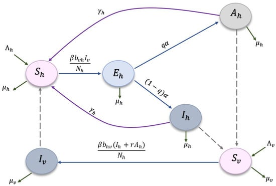 A schematic diagram for the transition and interaction between the various model states is shown in Figure 1, while the physical meaning of the model states and parameters is summarized in Table 1.