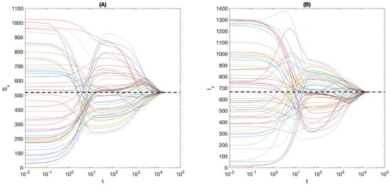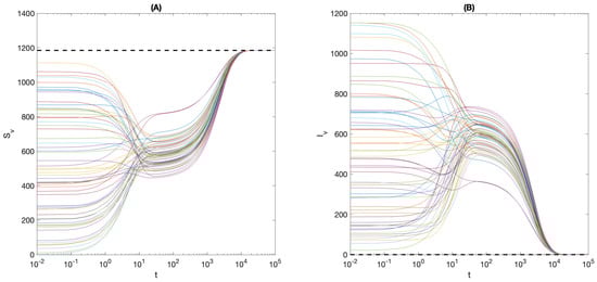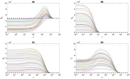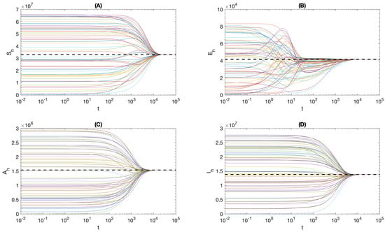 The asymptotic stability analysis of both the CL-free and CL-endemic equilibriums is established numerically. To this end, the function ode45 in Matlab, which is based on the Runge–Kutta method of order four, is employed to numerically solve model (1) with parameter values as presented in Table 2 and with various randomly generated initial conditions lying in the set . Extensive simulations are performed with a value corresponding to and the simulations are shown in Figure 2 and Figure 3. The figures show that if we start the solutions with any initial values lying in the domain , the number of exposed, asymptomatic, and infected humans and infected sandflies approach zero in the long time run, while those of noninfected humans and sandflies tend to their level at the CL-free equilibrium. In other words, all trajectory solutions are attracted by the CL-free equilibrium. It is worth mentioning that the horizontally broken lines represent the equilibrium solutions.