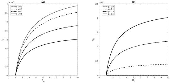 The endemic number of symptomatic (A) and asymptomatic (B) infected humans as a function of the basic reproduction number for various values of q, while keeping the rest of the model parameters’ values as in Table 2.
