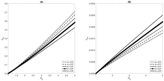 The endemic sandfly (A) and human (B) forces of infection as functions of the basic reproduction number for various values of q, while keeping the rest of the model parameters’ values as in Table 2.