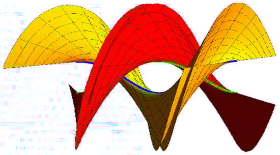 - If , , the ruled surfaces family {, } interpolates {, } as common geodesic curves as in (Figure 5):where the blue curve represents , the green curve is , , and .