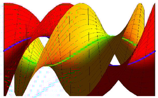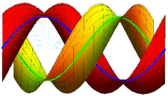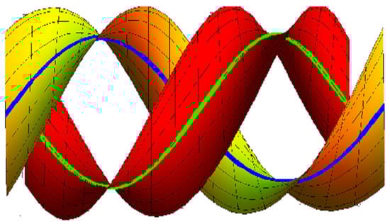 - If , , the ruled surfaces family {, } interpolates {, } as common geodesic curves as in (Figure 3):where the blue curve represents , the green curve is , , and .