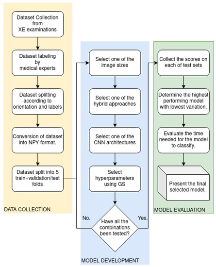 As Figure 1 shows, the methodology consists of three main parts—the dataset collection, model development, and model evaluation. The dataset collection was performed by medical experts and consisted of performing 2000 KXEs, labeling and splitting them, before converting them to an appropriate format for machine learning methodology to be applied. This was the second step, which mainly consisted of repeating the training process using the grid search (GS) hyperparameter variation approach and five-fold cross-validation on various image sizes and CNN approaches, which will be described going further. Finally, each of the models was evaluated, with the best-performing model being selected for further evaluation based on time performance.