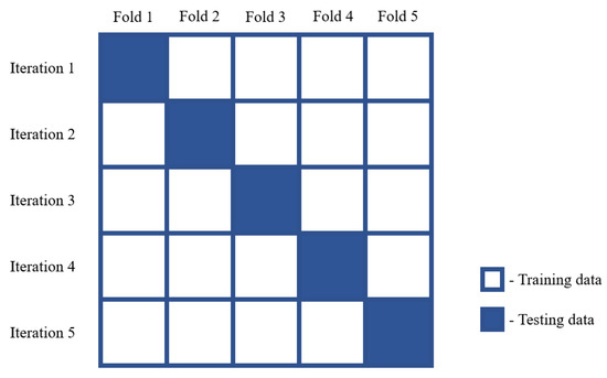where represents the predicted probability of the sample image belonging to the negative label and indicates the probability of the sample image belonging to the positive label [27]. As the real label of the image is known, due to the images being manually labeled, the error of this prediction can be calculated using the so-called cost function. The cost function indicates the error between the predicted label and the true label y. This process is referred to as forward propagation. The error is then propagated back through the CNN architecture in the process called back-propagation, and the internal parameters of the model are adjusted based on the value of the error [28]. This is the training process that adjusts the internal parameter values of the neural network model. The testing process involves the forward propagation of the separate part of the dataset which has not been used in the model training. The forward propagation is repeated for each image, with the model error noted, but no adjustment is performed [29,30]. Based on the noted classification values, the calculation of the model score can be performed, to determine how well the model performs the classification task on the given dataset. The described approach has a few issues. The main issue is overfitting, where the training process can be repeated for too many epochs, causing the model to generalize poorly beyond the data used for modeling. Another issue is the poor data distribution due to randomized selection—such as having a large number of unacceptable images in one of the subsets. As the selection between the training and testing sets is performed randomly, the selected training data may conform extremely well to the trained model, but the general model performance may in reality be extremely poor [31]. The K-fold method aims to address this by using the entire available dataset both for training and testing data [32], as visualized in Figure 3.