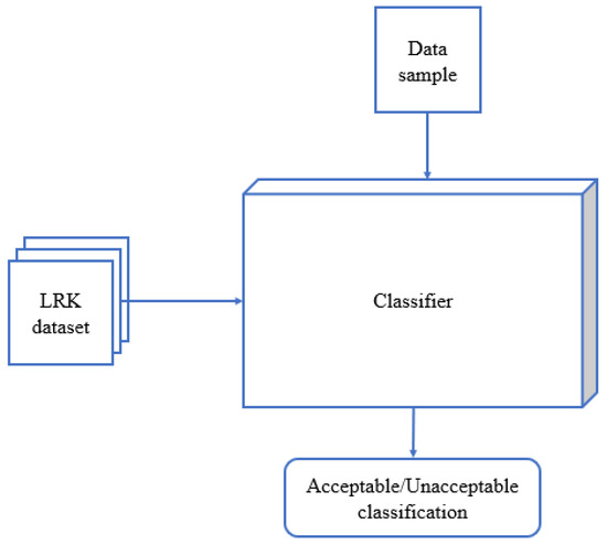 Multiple classification approaches have been considered, regarding dataset distribution and hybrid use of the described architectures. For each of the described approaches, a full training procedure was performed, meaning that all five described CNNs have been used, with full GS and cross-validation procedures on each of the separate datasets. In other words, this means that each of the CNN architectures, as presented in the previous section, has been used for each of the separate classifiers presented in the upcoming section. For example, in the approach where the left and right knees are used separately, with the first neural network used to discriminate the orientation and then two networks are used to classify the results as acceptable/unacceptable, each of the aforementioned CNN architectures has been tested for each of the tasks. The first tested approach is the most straightforward, and only concerns taking the LRK dataset and using it as the training/test set directly within the ML methodology as described. This is the most straightforward approach, but the possibility of poor performance due to image orientation differences has to be considered. CNNs are sensitive to image orientation [46], so it was suspected that this may lower the performance when this approach was applied. The schematic view of this approach is provided in Figure 4.