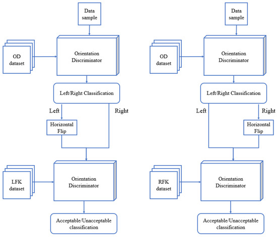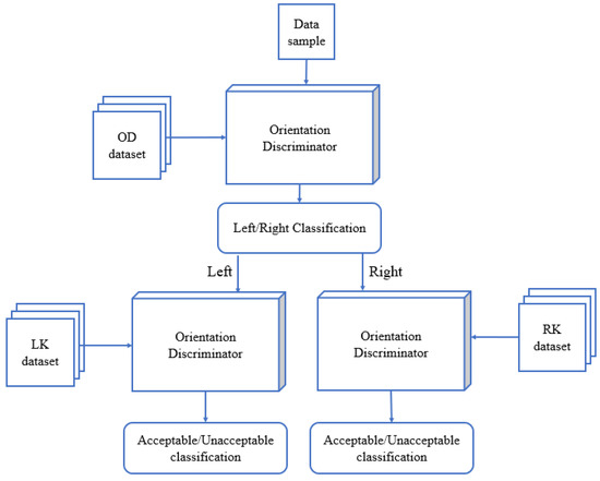 The second considered approach is a hybrid approach consisting of a network that first determines the orientation of the image, using the OD dataset. The LK and RK datasets are then used to train two separate models. Each of these models classifies the images as “acceptable” and “unacceptable”. Due to CNN sensitivity to image orientation, model convergence to a higher-quality solution may be easier when a single orientation of KXE is used. A schematic view of the OD-LK/RK hybrid model is given in Figure 5.