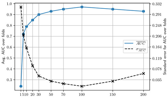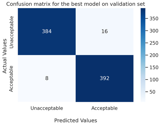Figure 7 shows that the average AUC score over folds steadily grows with more epochs, while the standard error steadily falls, until reaching 100 epochs. After 100 epochs, the score across folds starts to decrease, along with a standard error increase. This behavior indicates that the model overfits at higher epochs. To further illustrate the performance of the model as described, a confusion matrix of the entire hybrid approach is shown in Figure 8. A single cross-validation fold is randomly selected and used for evaluation, for brevity. It can be seen that on the selected validation set of 800 images (20%), the selected model classifies “acceptable” images as “unacceptable” and 16 “unacceptable” images as “acceptable”.