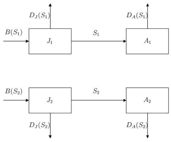 In this study, we consider two different maturation strategies adopted by the same population with a two-stage structure (juveniles and adults). The two maturation strategies can be adopted by juveniles. Different maturation strategies of juveniles lead to different birth rates and mortality rates of juveniles and adults. Same populations compete for shared resources. K is the carrying capacity. Without each other, the adult development follows logistical growth. The per capita birth rate (or ) denotes the average newborn juveniles per adult individual under maturation strategy (or ) per unit of time. The death rate or denotes the average death number of juveniles or adults under maturation strategy per unit of time. We denote by , the number of juveniles and adults that adopt maturation strategy , respectively, at time t. The flow chart is shown in Figure 1. Then, we consider the following stage-structured model with two different maturation strategies:
