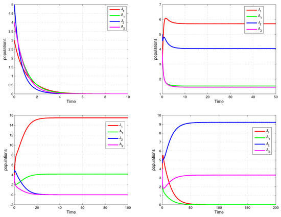 According to the Bendixson–Dulac theorem, there exists no closed orbit. Thus, the unique positive equilibrium is globally asymptotically stable for two-dimensional subsystem (15). This, together with the conclusion that the solution of the four-dimensional system (1) starting from initial values with , , finally approaches the point in the plane, implies that the boundary equilibrium is globally asymptotically stable for .