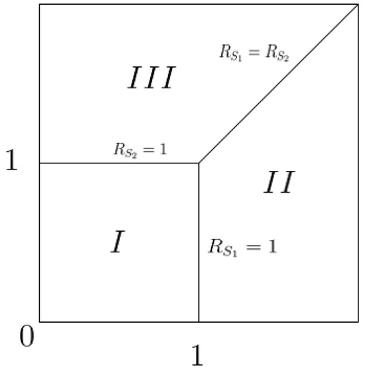 (3) Two-strategy coexistence: In order to achieve the coexistence of populations with different strategies, the basic reproductive numbers and must be equal and be greater than 1. In a biological sense, if two different mature strategies achieve the same level of benefits for the same population, then both of the populations with the two strategies can coexist at the same time or both populations with the two strategies can become extinct. In other words, when two strategies have equal fitness with the basic condition of the fitness being greater than 1, coexistence occurs. For example, in Figure 3, the solid line between Region II and III is the coexistence of two strategies.