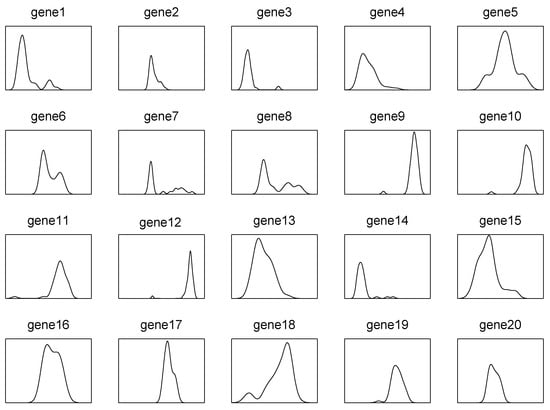 In this paper, we propose a new robust screening method for ultrahigh-dimensional grouped data. Our research was partly motivated by an empirical analysis of a leukemia dataset, consisting of 72 observations and 3571 genes, of which 47 were acute lymphocytic leukemia (ALL), and 25 were acute myelogenous leukemia (AML). Figure 1 plots the density function of the first 20 features selected from the 3571 genes of the 47 ALLs, from which it can be seen that all of them are far from being a regular distribution, most of them have sharp peaks and heavy tails (e.g., gene 9 and gene 12), and some of them are even multi-modal (e.g., gene 6 and gene 8), although these samples are from the same ALL group. This phenomenon challenges most of the existing methods. For example, the method in Pan et al. [18] might fail, if data are not normally distributed, and the method in Xie et al. [21] might lose efficiency when the distribution of a predictor is multi-modal. It is known that quantile-based statistics are not sensitive to outliers and heavy-tailed distributed data; thus, it was expected that the quantile-based screening method would be robust against heterogeneous data. Furthermore, compared to point estimation, quantile-based statistics can usually provide a more detailed picture of a predictor at different quantile levels. Motivated by the above discussion, we propose a quantile-composited screening approach, by aggregating the distributional information over many quantile levels. The basic idea of our method is straightforward. If has no contribution to predicting the category of an outcome variable, denoted by Y, at the -th quantile level, the conditional quantile function of given Y should be equal to the unconditional one, i.e, . Moreover, if and Y are independent, we have for all , where a.s. means ‘almost surely’. Thus, the equality plays a key role in measuring the independence between Y and . To quantify this kind of independence, we show that for a given is equivalent to the independence between the index variable and the label variable Y. Then, the equality between and is converted to testing the independence between two discrete variables, which can be easily checked by the Pearson chi-square test statistics. Finally, we aggregate all the discriminative information over the whole distribution in an efficient way, based on which, we establish the corresponding screening procedure. Our newly proposed screening method enjoys the following salient features. First of all, compared to the existing methods, it is robust against non-normal data, which are very common in high dimensions. Secondly, it is model-free, in the sense that we do not need to assume a specific statistical model, such as the linear or quadratic discriminant analysis model, between the predictor and the outcome variable. Thirdly, its ranking index has a very simple form, and the computational complexity is controlled at the sample size level, so that the proposed screening method can be implemented very quickly. In addition, as a by-product, our new method is invariant, in regard to the monotonic transformations of the data.