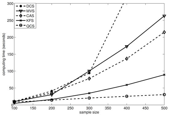 Computing time of different methods based on 100 replications, where QCS is our method, MVS is the MV-based sure independence screening method in [20], DCS is the distance correlation–sure independence screening procedure in [9], CAS is the category-adaptive variable screening in [21], and KFS is the Kolmogorov filter method in [19]. This simulation used Example 1, with .