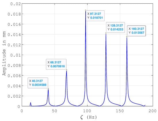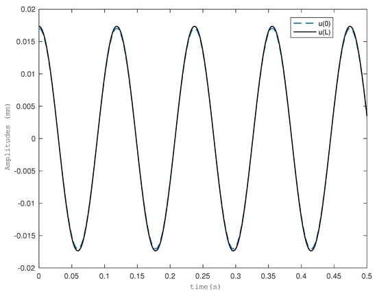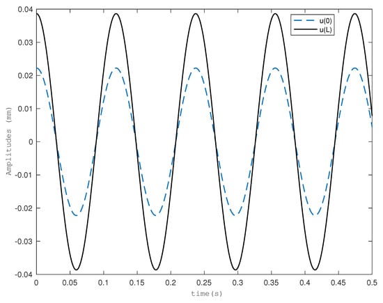 The differential operator was discretized using the Matlab Cheb/Chebfun algorithm in order to compute the associated eigenvalues []. Figure 2 shows the various values of the temporal frequencies that must be taken in the formulation of the eccentric masses frequency of rotation (mechanical part producing the percussion force). A maintained frequency around  produces a practical ration () in the amplitude boundaries from the top to the drill bit bouncing (Figure 3) which is an equilibrium in the forces supported by devices. Figure 4 illustrates an increase in amplitude at the expense of a rather strong input amplitude which may not be provided by the system. Finally, a set of the drillstring system parameters used in the simulation is presented in Table 1.