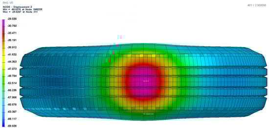 A static model validation comprises two tests—a footprint test and a vertical stiffness test. The footprint test shown in Figure 5 involved the application of a constant vertical load being applied to the tire to figure out the tire’s contact area. Vertical loads of 11.3, 22.5, and 45.0 kN were applied to the tire’s center on a hard flat surface, causing the tire to deform at its contact area. The total run time of the test was two seconds and the contact area was measured.