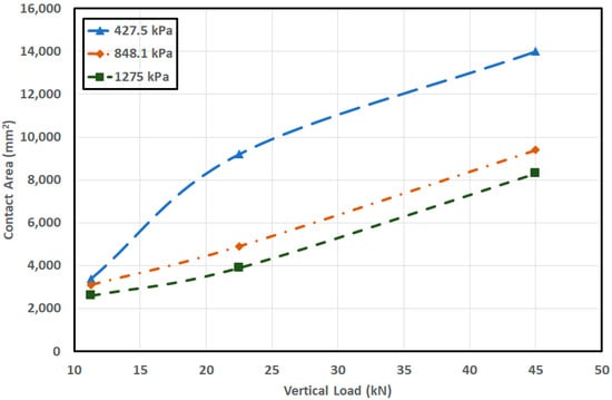 The results of the footprint test, consisting of the contact area at various inflation pressures and vertical loads, are shown in Figure 6. Based on the results, an increase in the inflation pressure resulted in a decrease in the contact area, whereas an increase in the vertical load resulted in an increase in the contact area in a non-linear fashion, and this trend was the same for all tire pressures. The data from the test were in agreement with the existing theory of inflation pressure and contact area. At an 11.3 kN vertical load, halving the pressure to 427.5 kPa reduced the contact area by 63%, whereas an increase of 50% in the pressure increased the contact area by 52%. At a 22.5 kN vertical load, halving the pressure to 427.5 kPa reduced the contact area by 37%, whereas an increase of 50% in the pressure increased the contact area by 92%. At a 45 kN vertical load, halving the pressure to 427.5 kPa reduced the contact area by 33%, whereas an increase of 50% in the pressure increased the contact area by 113%.