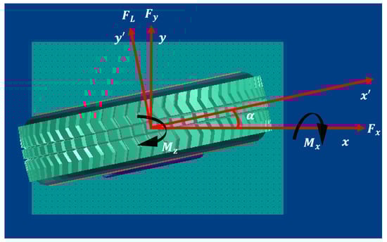 Pneumatic tires are the main components of light and heavy vehicles because they are objective to support the weight of a vehicle on its front and rear axles. Furthermore, the mechanical characteristics of these pneumatic tires play an important role in determining the accurate vehicle response properties, particularly when it comes to the vehicle dynamics field and control. Moreover, the handling performance is considerably affected by the tires of the vehicle. Therefore, truck tires have a significant effect on the performance of the truck under various operating conditions. In a cornering maneuver, the tire-cornering force is the lateral force that is generated due to the slip angles, which results in the tire’s steering from the direction of the wheel heading. In addition, tire lateral force is directly related to the lateral deformation of the tire due to the slip angles [1]. During cornering maneuvers, tires develop another force in the direction of the sliding surface, which is defined as the side force . While the cornering force and side force are usually not collinear, as shown in Figure 1 [2], it should be noted that, at the cornering maneuver, these two forces (the cornering force and the side force) develop a moment called the self-aligning moment, which is expressed as Equation (1).