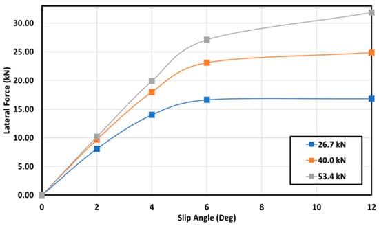 According to Figure 12, the lateral force varied linearly at slip angles below the +4 degree (positive slip angles), which resulted in a linear relationship between the lateral force and slip angles at a constant inflation pressure and certain speed. Therefore, the cornering stiffness could be determined as a linear equation in the range between the 0- and 4-degree slip angles [2]. It must be noted that the lateral force was described as a linear approximation at small slip angles that were lower than 4 degrees [11]. Moreover, Figure 12 reveals that increasing the applied vertical load on the tire rim led to the generation of a higher lateral force. It can be seen that the lateral force was by far at its maximum value with the 53.4 kN vertical load. It rose dramatically to a peak of approximately 33 kN with the 53.4 kN load, which made the tire realign strongly into its initial or original position in the direction of the traveling, due to large inertia forces.