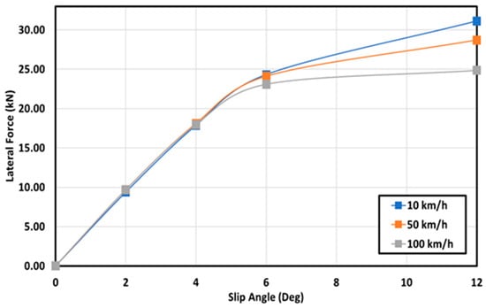 Figure 13 presents the results of the changes in the lateral force with variations in the operating speeds. According to Figure 13, a higher longitudinal speed provided a lower lateral force at small slip angles and followed a linear increasing trend. Although at larger slip angles, lateral force is directly affected by speed, at lower slip angles (below 4 degrees), lateral force can be estimated as completely linear, and it followed an increasing constant path for all three speeds. However, a drop in the longitudinal velocity led to the generation of small movements of the wheel at larger slip angles; therefore, the tire would tend to generate a higher lateral force. Therefore, at greater slip angles (between 6 and 12 degrees), the lateral force was slightly increased to reach an approximately maximum value of 31 kN at 10 km/h. Moreover, at the 10 km/h speed, the deformation of the tire from the center line was considerably more than the tires traveling at the 50 km/h and 100 km/h speeds. At larger slip angles, the value of the speed did not have a significant effect on the lateral force, and it provided a negligible amount of lateral force at the 12-degree slip angles. However, it can be noted that, at larger slip angles, the tire produced a larger sliding zone due to a higher lateral force, which led to a decreased adhesive zone for the tread elements of the tire entering the tire–terrain contact zone [17]. Additionally, it can be inferred from Figure 13 that, at lower speeds (10 km/h and 50 km/h), the tread pattern of the tire may not have gripped the road completely, which resulted in the generation of a higher lateral force. Moreover, it can be mentioned that the lateral force saw only a small rise to approximately 25 kN with the 12-degree slip angles and the 100 km/h speed. In this way, the contact patch of the tire lost considerable friction with the ground, which was a dry, hard surface in this research.