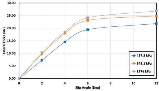 Figure 14 shows the variation in the lateral force as a function of the slip angle for the truck tire running at 100 km/h and different inflation pressures. The results from Figure 14 indicate that, at small slip angles and a higher inflation pressure, the tread elements deflected slightly and completely covered the contact zone; therefore, the sliding zone was much bigger with a linear cornering stiffness in the presence of a higher inflation pressure [19]. On the other hand, according to Figure 14, the lateral force was highly dependent on the tire inflation pressure and it could change remarkably due to the inflation pressure for a given speed. It was observed that, at a given speed and vertical load, an increase in the tire inflation pressure correlated to a decrease in the tire–terrain contact zone, which would directly lead to a reduction in the pneumatic trail. Therefore, both larger slip angles with a higher tire inflation pressure had a significant effect on the increase in the sliding of the rear contact zone of the tire–terrain contact patch, which resulted in a decrease in the tread adhesive zone [17].