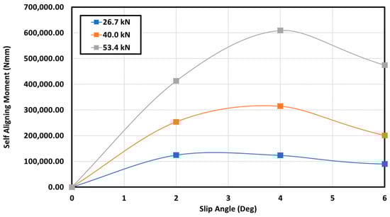 It can be observed in Figure 15 that an increase in the vertical load on the tire resulted in a higher self-aligning moment for a given slip angle. This was expected due to the contact patch increase as the load increased, which led to a larger pneumatic trail; hence, for a set of given conditions, there would be an increase in the self-aligning moment. As the slip angle increased, an increase could be seen for the self-aligning moments up to 2–4 degrees. This was expected, as a similar trend could be seen for the lateral force relative to the slip angles, and the lateral force was directly proportional to the self-aligning moment. Above a 4-degree slip angle, the self-aligning moment could be seen to decrease, which corresponded to the lateral force saturating for the same range of cornering.