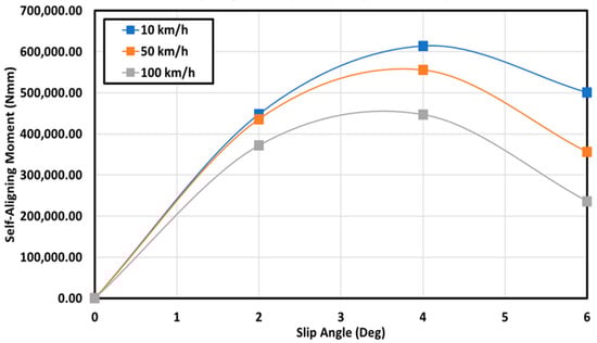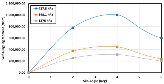 In Figure 17, the effect of the slip angle on the self-aligning moment at a 100 km/h longitudinal speed and several inflation pressures is shown. It can be seen that the self-aligning moment decreased with an increase in the inflation pressure at a given vertical load. This was expected, as an increase in inflation pressure would decrease the contact area of the tire and terrain, which would significantly reduce the pneumatic trail, resulting in a lower self-aligning moment for a given slip angle.