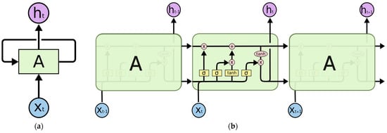 Single unit of an LSTM cell (folded and unfolded) []: (a) recurrent neural networks have loops; (b) the repeating module in an LSTM contains four interacting layers.
